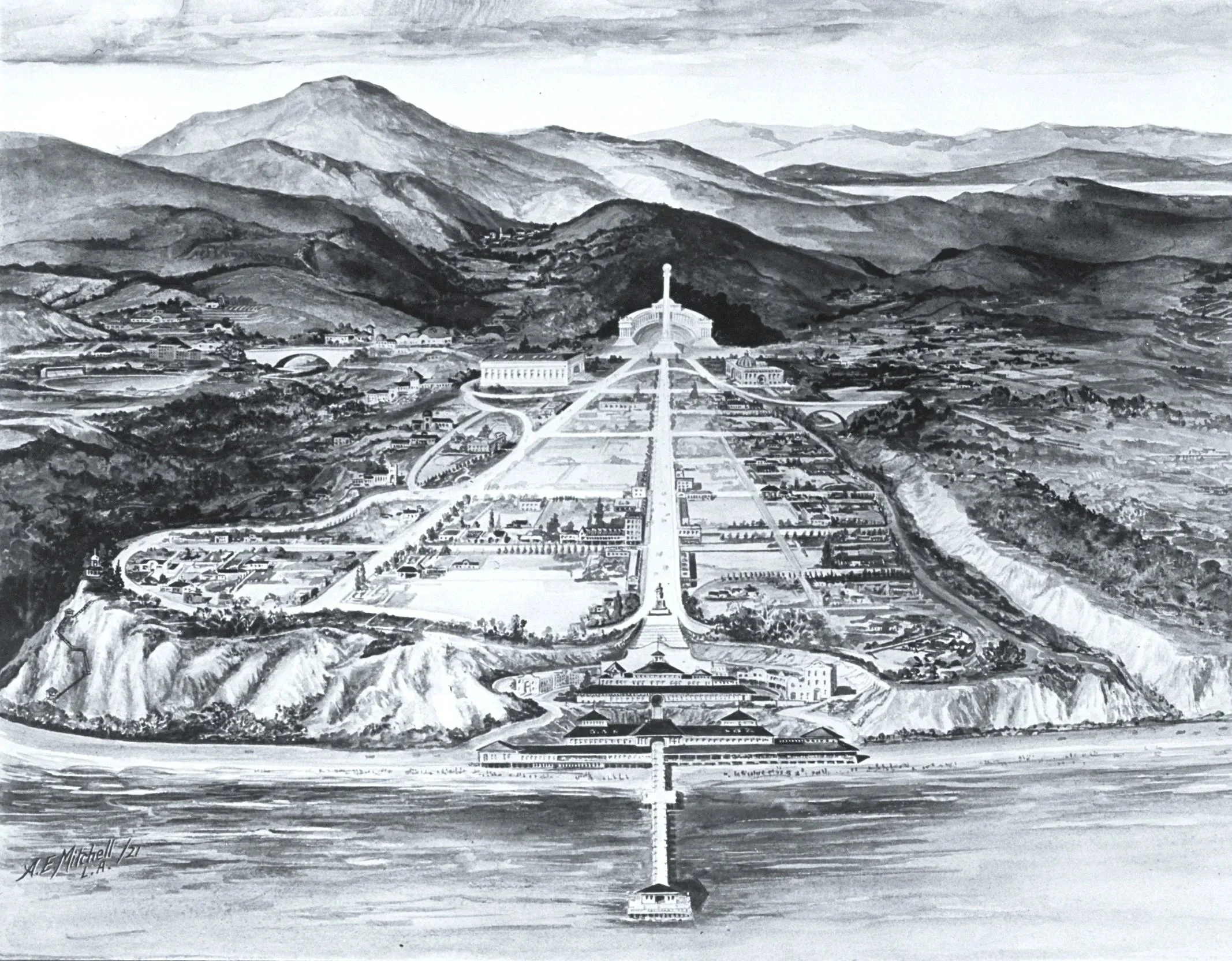 The background is A.E. Mitchell’s 1921 conceptual drawing of Pacific Palisades, CA for the original developers.